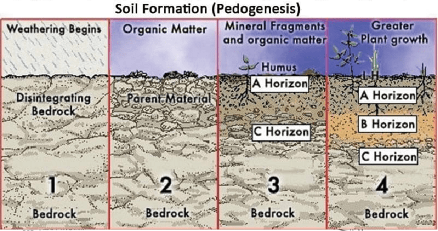 - Soil develops through a series of changes. The starting point is weathering of freshly accumulated parent material. Its culmination is seen in the development of complete soil profile with well stratified horizons.” – Hans Jenny (1994) in his “Factors of soil formation: a system of quantitative pedology”