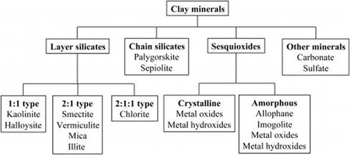 - There are six main types of clay minerals. The types are: 1. Kaolinite 2. Smectite Group 3. Illite Group 4. Vermiculite 5. Chlorite 6. Allophanes.