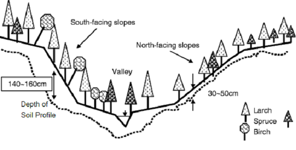 - Slopes facing away from the Sun are sheltered from direct insolation, and so tend to have cooler, moister soils.