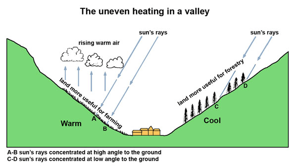 - Slopes facing toward the Sun are exposed to direct solar rays, raising soil temperatures and increasing evapotranspiration.