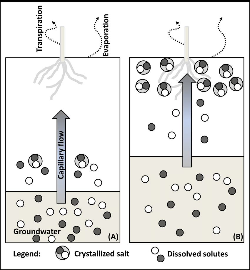 - Extreme evaporation translocates the salts due to upward movement (capillary action) to the surface.