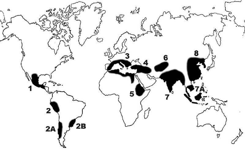 - Mexico-Guatemala, (2) Peru-Ecuador-Bolivia, (2A) Southern Chile, (2B) Paraguay-Southern Brazil, (3) Mediterranean, (4) Middle East, (5) Ethiopia, and (6) Central Asia.