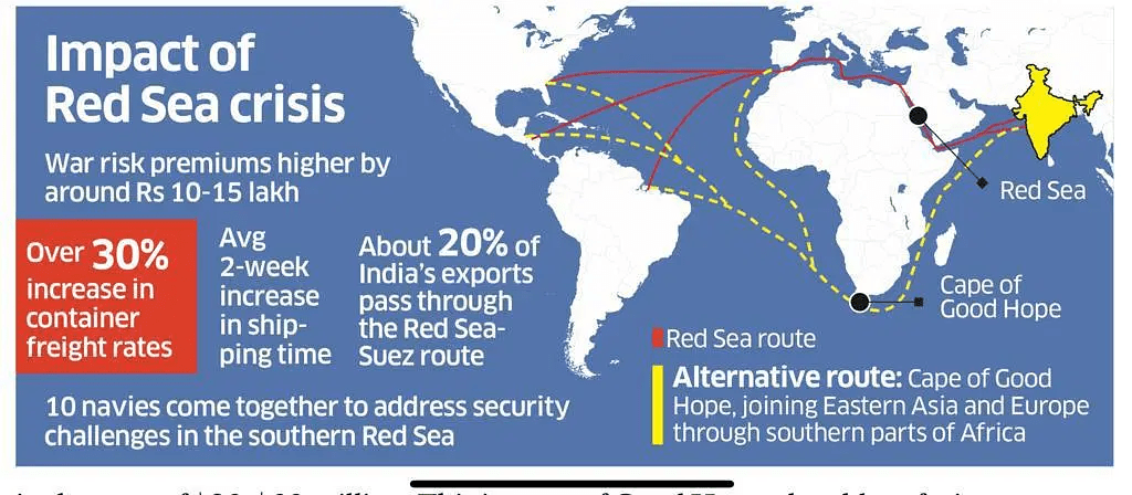 - Attacks from Houthis: Iran-backed Houthi rebels of Yemen attacking ships near the Bab el-Mandeb strait, leading to concerns about the safety of the Red Sea-Suez Canal route.
