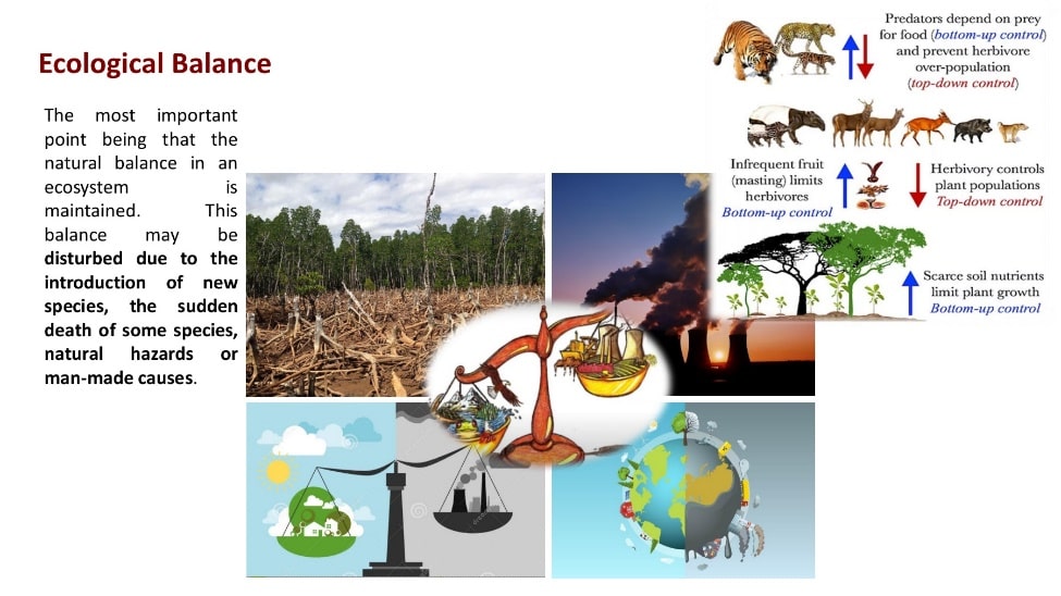 - Ecological balance is a stable balance in the numbers of each species in an ecosystem.